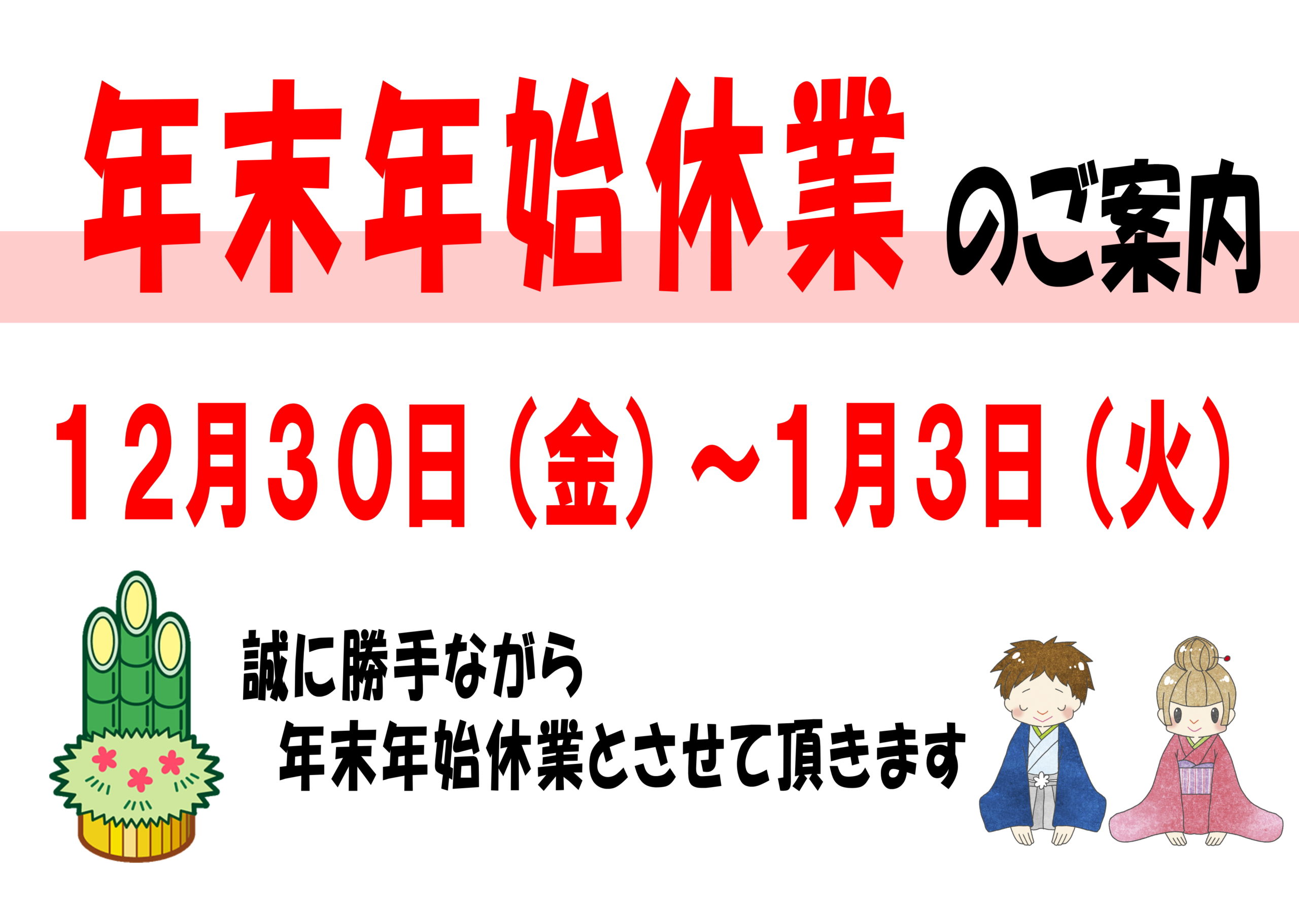 年末年始休業(12/30~1/3)のご案内